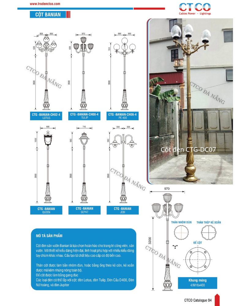Cột đèn trang trí sân vườn CTG-Banian ( trụ đèn CTG-DC07) có đế cột được làm bằng gang đúc tròn, nhôm đúc hoặc nhôm đùn áp lực cao tạo nên thân cột, giúp cột trụ vững, cùng bề mặt anốt hóa và lớp sơn tĩnh điện. Đó chính là điểm cộng giúp cột “mạnh mẽ" chống lại các tác nhân oxi hoá từ môi trường, bảo vệ bề mặt luôn vẹn nguyên theo tháng năm. Khi sử dụng, ta cũng có thể khéo léo kết hợp cùng nhiều loại đèn sân vườn trang trí với các mức công suất khác nhau. Cùng tìm hiểu bản mô tả sản phẩm dưới đây, chắc hẳn bạn sẽ hiểu rõ hơn về dòng sản phẩm thú vị này: