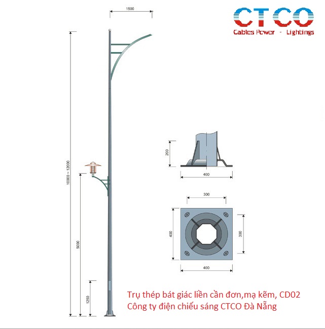 Cột đèn bát giác liền cần đơn mạ kẽm 6m 8m 9m 10m tại Đà Nẵng, do công ty Điện chiếu sáng CTCO Đà Nẵng cung cấp tại khu vực các tỉnh miền Trung tây Nguyên.