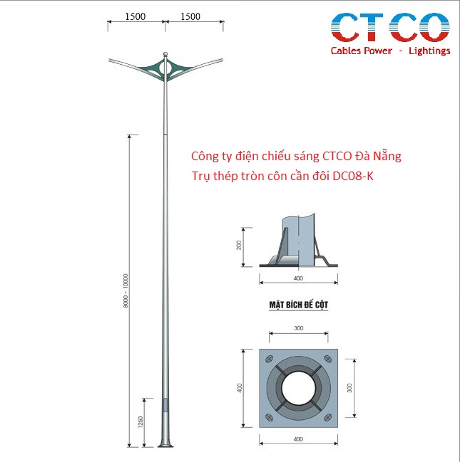 Cột đèn chiếu sáng 5m cần đôi mạ kẽm CD08-k tại Đà Nẵng, do công ty Điện chiếu sáng CTCO Đà Nẵng cung cấp tại khu vực các tỉnh miền Trung tây Nguyên.