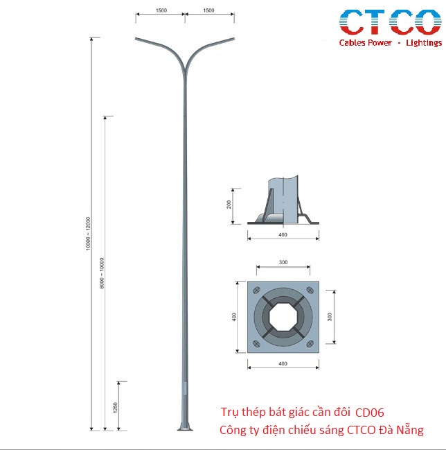 Cột đèn chiếu sáng 6m cần đôi mạ kẽm CD06 tại Đà Nẵng, do công ty Điện chiếu sáng CTCO Đà Nẵng cung cấp tại khu vực các tỉnh miền Trung tây Nguyên.